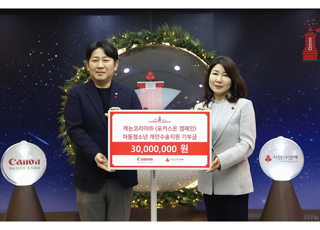 ‘포커스온 캠페인’은 선천성 백내장, 사시, 녹내장, 안검하수, 당뇨망막증 등 안질환으로 고통받는 저소득층 아동과 청소년들에게 개안 수술비를 지원하는 캐논코리아의 사회공헌 활동이다. 캐논코리아가 전달한 기부금은 ▲환아의 안질환 조기 발견 ▲실명 예방을 위한 홍보 활동 ▲수술 지원이 필요한 취약계층 아동 및 청소년의 치료에 쓰일 예정이다.
