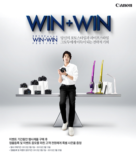 ‘캐논 WIN WIN 페스티벌’은 2012년 2월 1일부터 2012년 3월 15일까지 구매한 제품에 한해 3월 22일까지 캐논코리아컨슈머이미징 홈페이지(www.canon-ci.co.kr)에서 정품 등록을 하면 참여 가능하다. 캐논은 이번 프로모션에 참여한 고객에게 푸짐한 사은품을 제공한다.