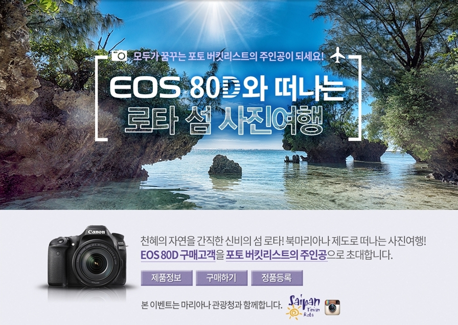 우선, EOS 80D의 구매 고객 대상으로 천혜의 자연을 간직한 신비의 섬 로타의 아름다운 자연 풍경을 사진으로 담아낼 기회를 선사하는 'EOS 80D와 떠나는 로타 섬 사진 여행' 이벤트를 진행한다. 이벤트 대상은 4월 4일(월)부터 5월 31일(화)까지 EOS 80D를 구매하고 정품 등록을 완료한 고객으로 캐논 홈페이지 내 이벤트 페이지에 로타로 사진 여행을 가고 싶은 이유와 본인의 SNS 주소를 적으면 응모 가능하다. 캐논은 응모 고객 중 추첨을 통해 선정된 30명에게 오는 6월 22일(수)부터 6월 26일(일)까지 4박 5일간 북마리아나 제도 로타 섬으로 떠나는 사진 여행에 참여할 기회를 제공한다.