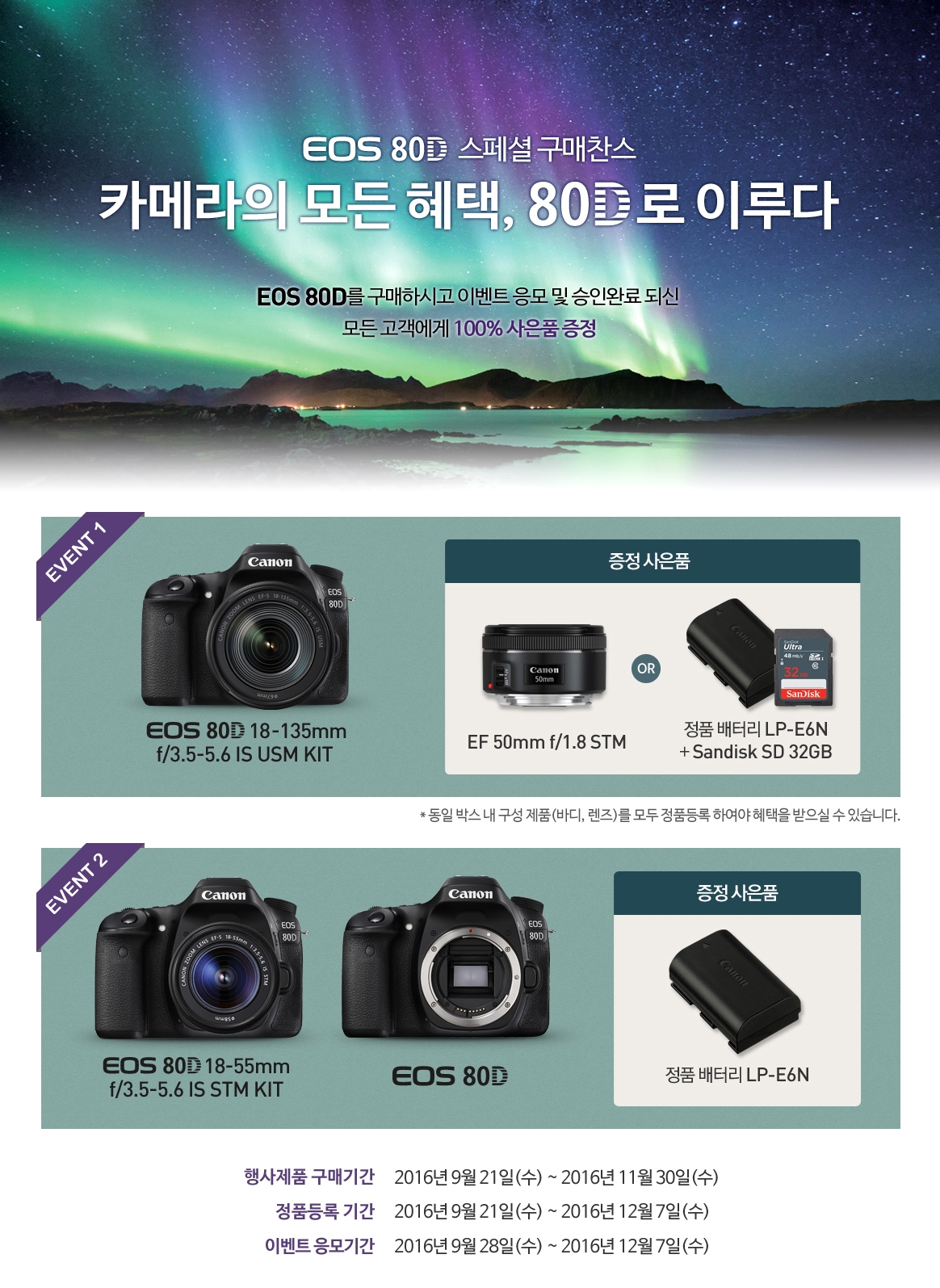 이벤트 대상 제품은 EOS 80D 카메라와 EOS 80D 렌즈 KIT 2종(EOS 80D 18-135mm f/3.5-5.6 IS USM KIT와 EOS 80D 18-55mm f/3.5-5.6 IS STM KIT)이다. 이벤트 참여 방법은 9월 21일(수)부터 11월 30일(수)까지 제품을 구매하고 12월 7일(수)까지 정품 등록 진행 및 이벤트 응모를 완료하면 된다. 하나의 아이디 당 한 번만 응모 가능하며 KIT 제품의 경우 카메라 바디와 렌즈를 모두 정품 등록해야 이벤트 응모가 가능하다.