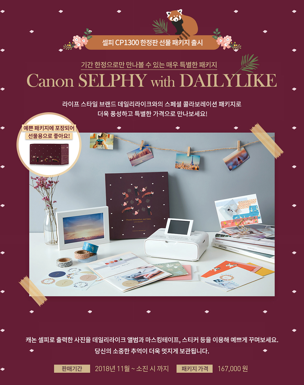 ‘캐논 셀피 with 데일리라이크’ 스페셜 패키지는 크리스마스와 연말연시 마음을 전할 선물의 계절에 적합한 패키지다. 패키지는 라이프 스타일 브랜드 데일리라이크와의 스페셜 콜라보레이션해 D.I.Y할 수 있는 사진 아이템들로 구성됐다. 화이트 색상의 포토프린터 셀피 CP1300에 엽서 사이즈 용지 54매, 스페셜 기프트 세트로 이뤄져 있다. 사진으로 인화해 인테리어 소품으로 장식하거나 가족의 이야기를 보다 특별하게 기록하는 앨범을 만드는데 안성 맞춤이다.