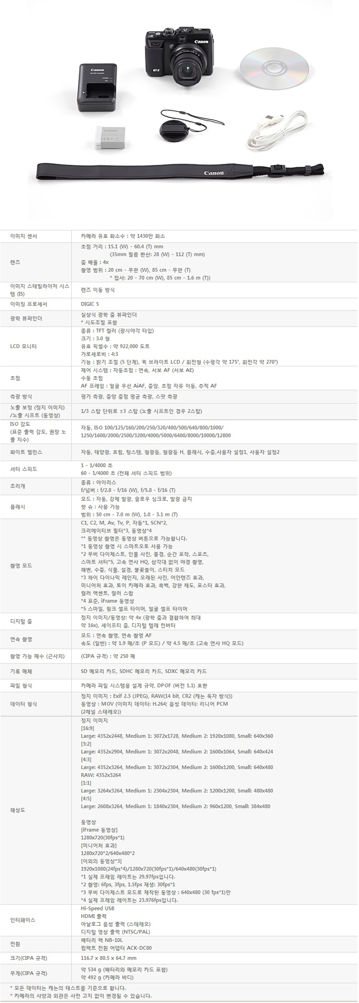 PowerShot G1 X는 약 1400만화소의 센서를 가지고 있으며 4배줌의 렌즈가 장착이 되어 있습니다. LCD의 화소는 92만 도트로서 G12모델 대비 매우 선명한 화상을 보여주고 있으며 화소도 400만화소 업그레이드 된 것 외에도 주요 스펙들이 대폭적으로 업그레이드 되었습니다.