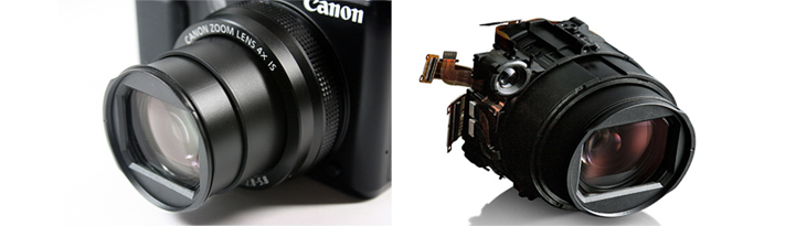 PowerShot G1 X의 렌즈는 센서의 크기에 맞추어서 불필요한 상하부분을 잘라서 구현한 렌즈 입니다. 렌즈가 커지는 것을 방지하고 그 공간을 보다 효율적으로 활용하게 됩니다. PowerShot G1 X 에는 UA 렌즈가 사용되었습니다. UA는 Ultra high refractive index Aspherical 약어로 캐논이 개발한 초 고굴절률 유리 몰드 비구면 렌즈이며 PowerShot G1 X의 고성능 소형화에 기여하고 있습니다. 렌즈 구성은 크게 4 부분으로 나누어져 있으며 각각의 구성에 광각 측의 수차 보정과 망원의 수차 보정 그리고 포커스 조정시의 수차를 보정하는 기능이 들어가 있습니다. 센서 크기 대비 DSLR 보다 작은 바디로 인해서 렌즈 구성에 따른 기능 구현이나 성능에 따른 부분은 신규로 개발 되었으며 많은 부분의 노력과 시간이 소요되었습니다.