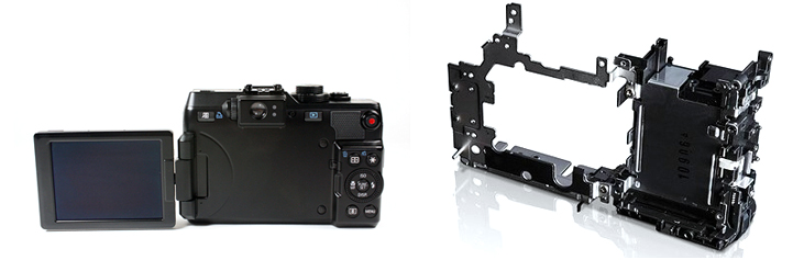 외부재질은 본체의 전면 커버뿐만 아니라 후면의 리어 커버에 금속을 채용하여 단단함과 고급스러움을 연출하였습니다. LCD 액정 앵글 뒤에 금속 부품을 사용한 것은 G시리즈 중 PowerShot G1 X에 최초로 적용 되었습니다. 그리고 전면 및 후면 커버의 이음새가 보이지 않게 디자인 되어 있어 상당히 고급스러운 느낌을 주고 있습니다. PowerShot G1 X에 사용된 부품은 PowerShot G12와 중복 되는 부분 없이 대부분 새롭게 제작되었습니다.