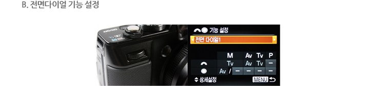 전면 다이얼과 후면 다이얼의 기능을 촬영 모드 별로 설정할 있습니다. 촬영하는 취향에 따라서 다이얼 부분의 세팅을 변경할 수 없으면 불편함을 느낄 수 있는데, 이런 부분도 기능적으로 설정할 수 있어 편리합니다.