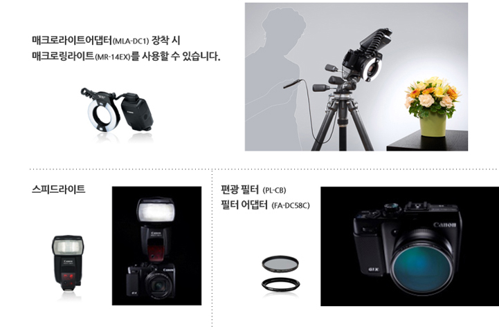 PowerShot G1 X는 기존의 EOS 액세서리와 호환해서 사용할 수 있습니다. 스피드라이트와 매크로 링 플래시와도 완벽한 호환이 가능합니다.