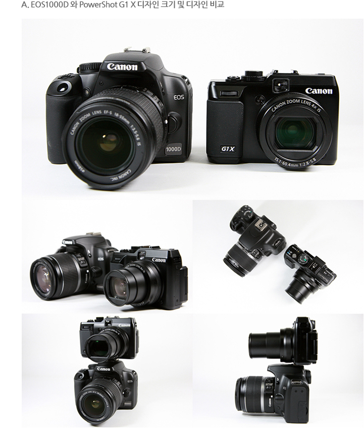 캐논의 보급형 DSLR EOS 1000D는 작은 크기의 바디이지만 PowerShotG1 X 와 비교하면 크기가 상대적으로 큰 편에 속합니다. 그리고 EOS 1000D는 렌즈가 장착되어 있는 형태로 보관을 하면 부피를 많이 차지하게 됩니다. 하지만 PowerShot G1 X 의 경우 전원 OFF 시 렌즈가 바디 안쪽으로 수납되기에 보관 시나 이동 시 부피를 줄일 수 있는 장점이 있습니다. EF-S 18-55mm IS (28.8-88mm / 35mm 환산 화각)렌즈보다 더 긴 화각인 28-112mm를 지원해 주지만 크기 면에서는 더 작은 구조로 되어 있습니다. 이런 점을 PowerShot G1 X의 장점 중 하나로 볼 수 있습니다.