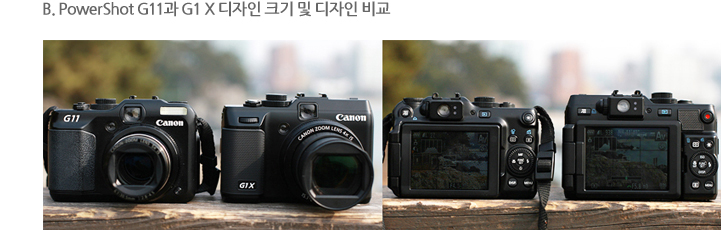 PowerShot G1 X의 경우 PowerShot G11과 비교하여 무게와 크기가 증가하였습니다. 그리고 신형 1.5형 CMOS 센서를 탑재함에 따라 렌즈가 더 도출되어 길이가 길어졌습니다. 전체적인 배열이나 위치는 거의 동일하게 디자인으로 되어 있습니다. 그립부분은 세밀한 돌기부분을 이용해서 그립감을 상당히 개선하였습니다.