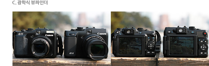 PowerShot G1 X는 광학식 뷰파인더를 지원을 합니다. 약 77% 시아율로 넓은 편은 아니지만 배터리가 없거나 액정을 사용할 수 없는 경우 유용하게 쓸 수 있습니다. 초점 정보는 우측에 작은 LCD에 녹색불이 깜빡이는 것을 보고 확인할 수 있습니다. 또한 DSLR처럼 시도 보정 기능도 지원하고 있습니다.