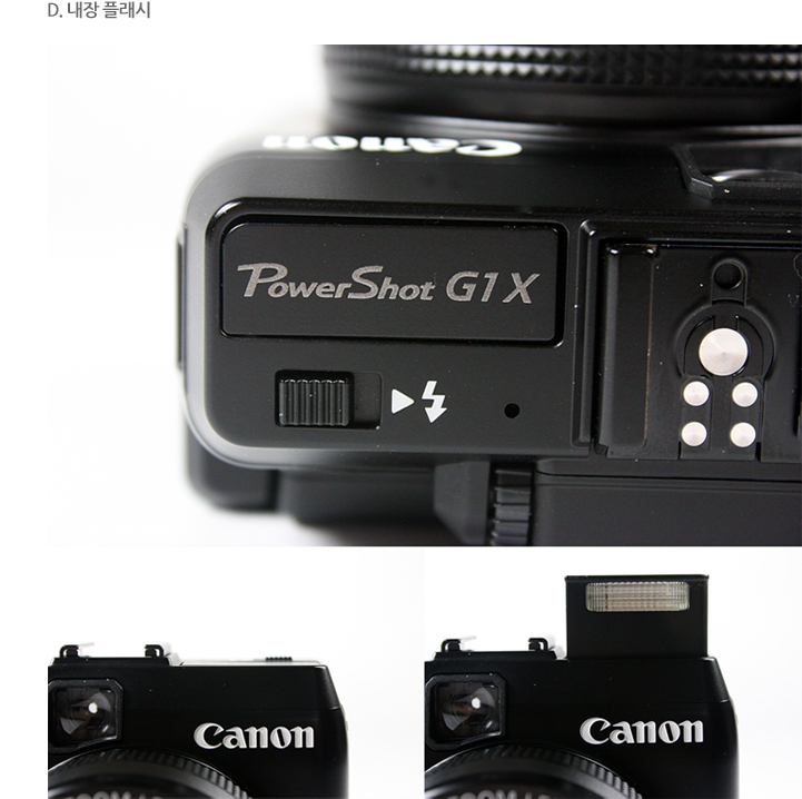 내장 플래시의 경우 고급형 하이엔드답게 자동형이 아닌 100% 수동 형태로 지원을 하고 있습니다. PowerShot G1 X 의 경우 고감도 노이즈 부분이 상당히 좋아서 어두운 실내에서도 플래시를 사용해야 되는 경우가 많지는 않습니다. 100% 수동 팝업 방식을 지원하고 있기 때문에 촬영 시 자동으로 플래시가 팝업이 되는 현상을 원천적으로 막아주고 있습니다.