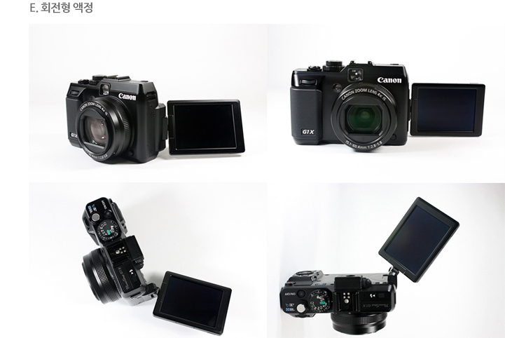 회전형 액정은 로우앵글이나 하이앵글 촬영 시 매우 유용하게 사용할 수 있습니다. 셀프 사진을 촬영할 때 상당히 많이 사용하게 되며, 풍경사진이나 야경 촬영 시에도 편리하게 사용할 수 있습니다. 회전형 후면 LCD의 장점은 앵글에 구애 받지 않고 자유로운 촬영이 가능하다는 점입니다.