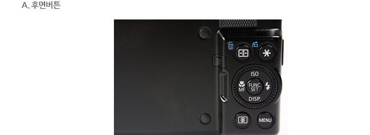 PowerShotG1 X의 후면 버튼은 매우 간결한 디자인으로 변경되었습니다. 우측에는 총 5개의 버튼과 하나의 다이얼로 구성되어 있습니다. 후면 버튼을 통해서 AF 포인트 이동, ISO, MF, 플래쉬, DISP, 측광 메뉴 등과 같은 주요 기능들을 제어 할 수 있습니다. 다이얼 부분은 조작감이 매우 부드럽고, 회전이 되면서 동작이 되는 느낌을 줍니다. 버튼을 눌렀을 때의 촉감은 좋은 편입니다.