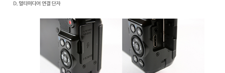 PowerShot G1 X는 오디오 단자와 HDMI 단자도 지원을 해주고 있습니다. HDMI 단자를 지원하는 디스플레이 기기에 연결을 할 수 있습니다. 단자를 연결해 주는 곳에 덮개는 고무가 아닌 경첩 부품을 이용해서 견고하게 처리하였습니다.
