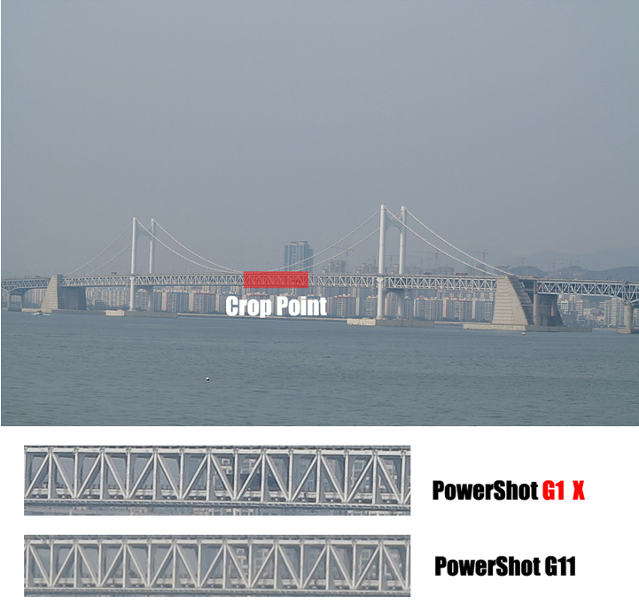 날씨가 비교적 흐린 날 Powerhot G11 과 Powerhot G1 X의 이미지 해상력을 비교해 보았습니다. 촬영 결과 센서의 크기 차이로 인해서 해상력과 디테일에 많은 차이를 보였습니다. 특히 철골의 나사선이나 구조 부분을 PowerShot G1 X 의 경우 매우 디테일 하게 표현해 주고 있었습니다. 기존의 모델인 PowerShot G11 과 PowerShot G12에 비해서 상당히 강력한 해상력을 보여주었습니다.
