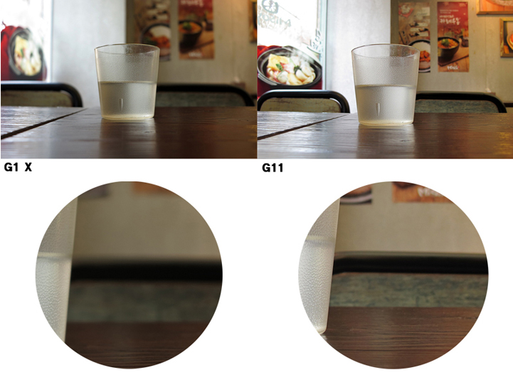 PowerShot G11과 PowerShot G1 X를 동일한 위치에서 동일한 화각으로 촬영한 비교 사진을 보면 PowerShot G1 X의 물컵 뒤쪽 배경 부분이 훨씬 더 흐릿하게 잘 표현되었습니다. Powersho G11 대비 PowerShot G1 X는 약 2.6배 정도 개선된 아웃포커싱 성능을 가지고 있습니다. 센서의 크기가 커지면서 DSLR에서만 표현할 수 있는 부분을 이미지 처리 방식이 아닌 렌즈와 센서의 기능을 이용하여서 제대로 된 아웃포커싱을 표현을 해주고 있습니다.
