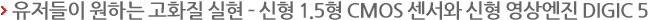캐논의 1.5형 CMOS 센서의 경우 화질과 노이즈 처리 부분에 중점을 두었다고 합니다. 사진 결과물이 높은 해상력과 적은 노이즈에 의한 깨끗한 사진 결과물을 얻을 수 있게 해주었습니다. 센서의 크기가 일반 자동 디지털 카메라에 비해서 면적이 약 6배 정도 커져서 아웃포커싱이 중요시 되는 인물사진부터 심도 깊은 풍경사진까지 모든 부분을 자유 자재로 표현하고 컨트롤 할 수 있었습니다.