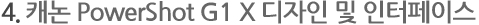 PowerShot G1 X는 기존 EOS 시스템과 유사한 외부 인터페이스를 가지고 있습니다. 약92만 도트의 LCD를 채용하였으며 이것은 EOS에 장착된 LCD에 준하는 고사양 액정입니다. 또한 회전형 액정을 채용하여 촬영에 편리성을 더해 주고 있습니다. EOS 액세서리와도 완벽한 호환성을 가지고 초당 4.5매의 고속연사도 가능해 졌습니다. 바디의 무게는 묵직하면서 안정적인 느낌을 줍니다.