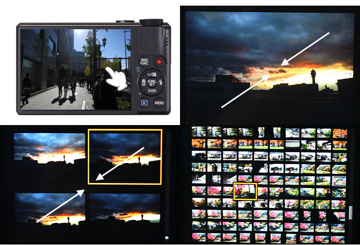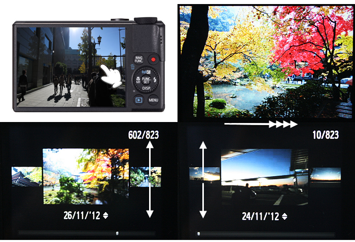 이전 모델에서는 사진 재생 기능을 사용 할 때 버튼을 조작해서 넘기는 구조였지만 powershot s110에서는 터치 기능을 사용할 수 있기 때문에 시중에 나와 있는 터치 방식을 사용하는 다양한 it 기기와 같은 사용 방법으로 편리하게 사진 보기가 가능하다.