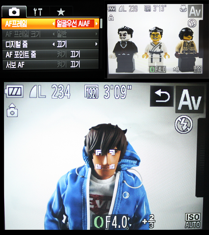 위와 같이 애니메이션에 나오는 주인공과 같은 실제 사람과 다른 비율의 얼굴은 인식을 하지 않고 다른 곳으로 af 포인트를 잡게 된다. 다만 사람과 똑같이 생긴 조형물이나 인물의 사진은 해당 얼굴에 af 포인트가 나타나 af를 잡게 된다.