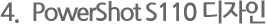 s series 는 s10 시절부터 자신만의 디자인을 철저히 지키면서 유행을 타지 않는 디자인으로 발전을 하였다. powershot s 시리즈는 필자의 주변 사람의 경우, 처음 봤을 때 디자인이 너무 단순해서 성능도 단순하게 판단을 하는 경우를 봤는데 실제 촬영된 사진 결과물과 기능을 확인하게 되면 그 완성도에 높은 만족을 나타내는 경우를 종종 볼 수 있었다. 디자인과 성능이 꼭 비례한다고 볼 수 없겠지만 그런 면에서 s110은 심플한 디자인임에도 높은 성능을 확실히 보여주고 있다.