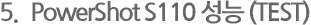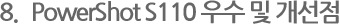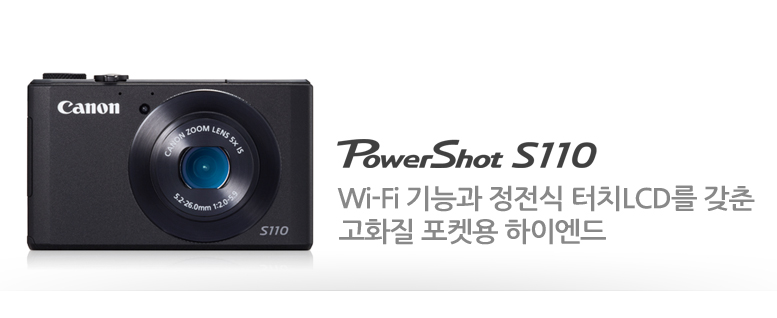 치열한 컴팩트 카메라 시장에서 꾸준한 성능 향상으로 새로운 모델이 나오는 것은 컴팩트 카메라 유저로써 반가운 일이다, 스마트 폰의 카메라 기능이 휴대성과 무선 공유를 강점으로 컴팩트 카메라를 위협하고 있지만 카메라 본연의 우수한 화질과 고화질의 기본이 되는 렌즈 광학 기술, 그리고 이미지 처리 능력에서 보여주는 속도와 고감도 성능은 아직도 컴팩트 카메라의 상품성이 스마트 폰의 카메라 기능에 비해 뛰어남을 보여주고 있다. 더 작아진 디자인을 통해 휴대성을 높이고 터치 기술을 통한 익숙하면서도 편리한 조작성, 그리고 wi-fi 기능 추가를 통한 무선 공유 능력이 추가된 powershot s110은 컴팩트 하이엔드 카메라의 기본적인 요소를 충족시키면서 최근 유행하는 기술도 모두 접목을 시켜 새로운 방향으로 나아가고자 하는 모습을 보여주고 있다. 작지만 언제 어디에서나 휴대 하고 다니면서 즐거운 사진을 찍을 수 있는 카메라. 나의 작은 일상을 언제나 기록할 수 있게 해주는 카메라. 언제나 믿고 사용할 수 있는 그런 컴팩트 하이엔드 카메라가