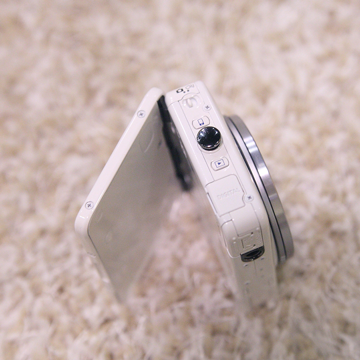 앞면이 심플하고 뒷면이 전면터치 LCD이기 때문에 옆쪽에 기능 버튼들이 달려있는데요~ 사진을 찍으면서 작동하는 기능들은 주로 터치로 모두 이루어지고 ON/OFF 나 재생, 대표적인 촬영모드 전환은 외부버튼을 통해 작동해요.
