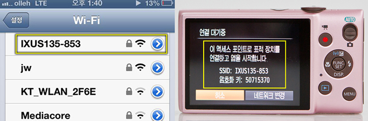 진행하는 과정은 다음과 같습니다.(IXUS 255 HS와 IXUS 135로 연결 진행)