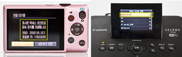 여기에서는 IXUS 255HS와 캐논 포토 프린터 CP900을 연결하여 무선 프린트를 해보겠습니다.