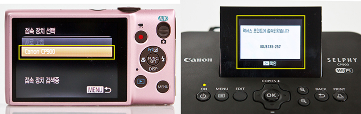 (6) 카메라에서 [Canon CP900]을 인식하면, CP900에 [액세스 포인트에 접속] 완료 화면이 표시됩니다.