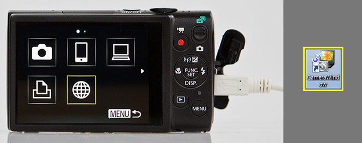 (1) 제품에 동봉된 USB 케이블을 통해 디지털 카메라를 컴퓨터에 연결합니다. 연결한 다음 [CameraWindow] 프로그램을 실행합니다.