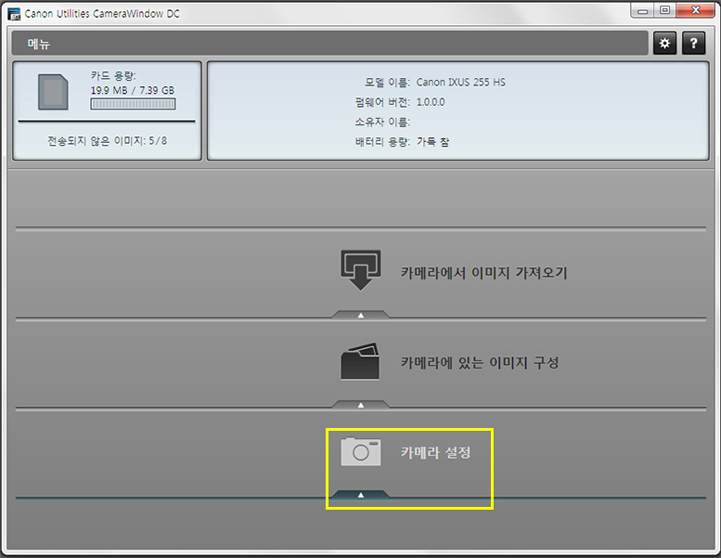 (2) 프로그램이 실행되면 하단에 [카메라 설정] 메뉴를 선택합니다.