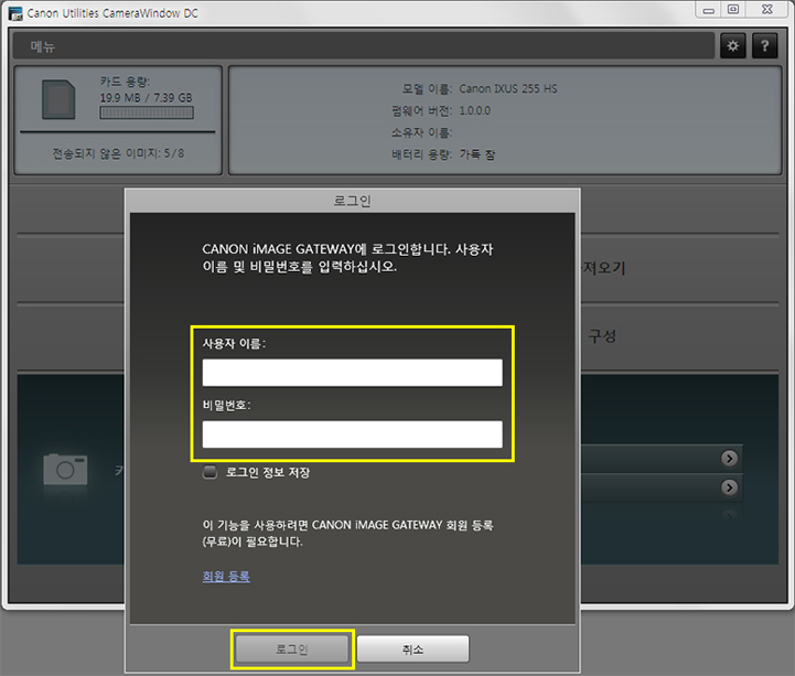 (4) [CANON iMAGE GATEWAY]에 가입한 사용자 이름과 비밀번호를 입력하고 로그인합니다.