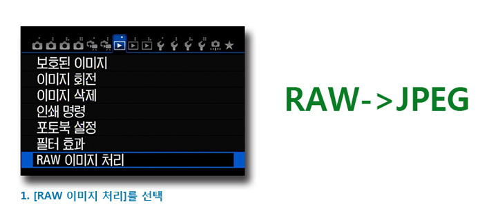 RAW 이미지 처리는 카메라 내에서 RAW 파일을 JPG 이미지로 변환할 수 있는 기능입니다.