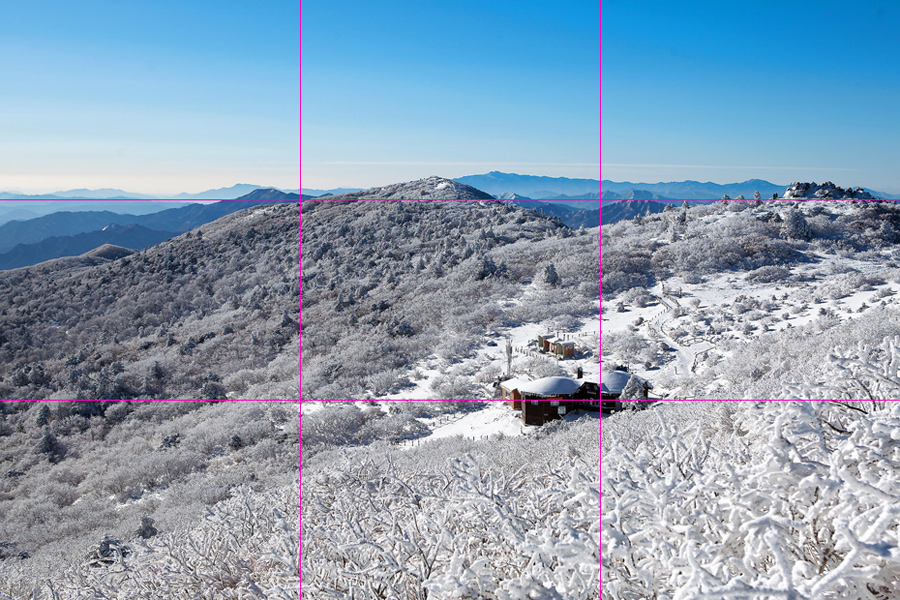 삼등분할 구도는 화면을 가로세로 삼등분 하고 그 교차점에 피사체를 배치해 시선의 흐름을 자연스럽게 하고 공간감을 만들어 주는 구도입니다.