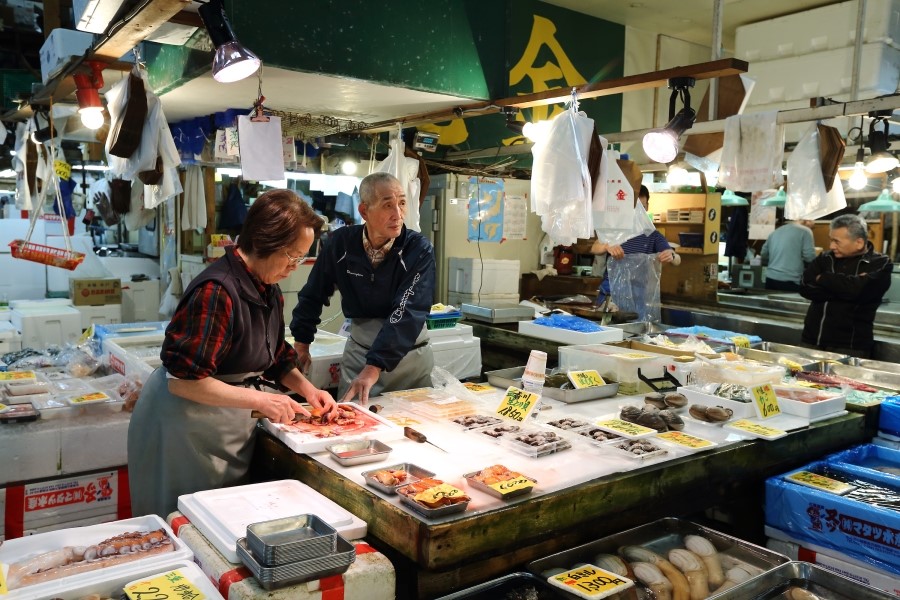 시장 주위를 둘러보다 인근 도매상에서 경매를 통해 들어온 참치를 해체하는 작업을 마주쳤습니다. 망원렌즈를 이용해 참치 그림이 그려진 배경과 함께 작업하는 직원의 모습을 앵글에 담았습니다. 깔끔히 포장된 생선을 상자에 담는 모습은 광각렌즈로 힘있게 표현했습니다.