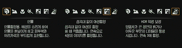SCN모드는 다양한 촬영 환경에 맞는 자동 설정을 지원하고 있다. SCN모드에 HDR 역광 보정 모드를 기본 지원하고 있지만 사용자가 노출차를 조절하여 HDR 촬영을 진행하고자 한다면 SCN모드 외 Menu에 있는 HDR 촬영 모드를 권장하는 바다.