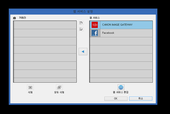 기존에는 캐논 이미지 게이트웨이만 설정 체크 표시가 있었지만, 페이스 북 설정을 통해 페이스 북의 설정 체크도 표시된 것을 알 수 있다.