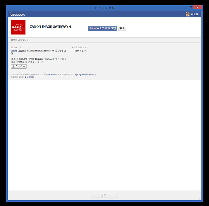 캐논 이미지 게이트웨이4라는 페이지를 페이스 북에 연동 시켜줘야 한다. 페이스 북에 로그인 후 '허가'를 클릭해주면 모든 설정이 끝난다.