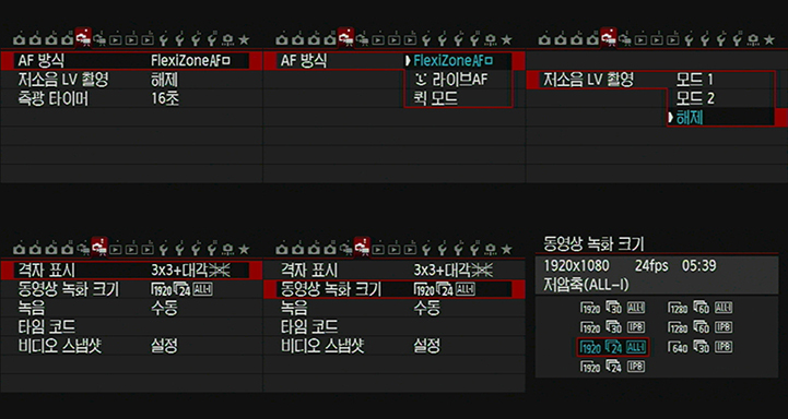라이브 뷰 촬영 시에 설정할 수 있는 모든 기능을 공유한다. 동영상 녹화 크기는 다양한 압축 방식의 적용으로 편집 시에 유용하다. 새롭게 추가된 ALL-I/IPB 방식은 영상 편집 실무 환경의 피드백에 의해 추가된 압축 방식이다. ALL-I는 1 프레임 마다 압축하는 방식으로 파일의 용량은 커지지만, 프레임 간의 연결이 없으므로 컷 편집 시 매우 적절하다.