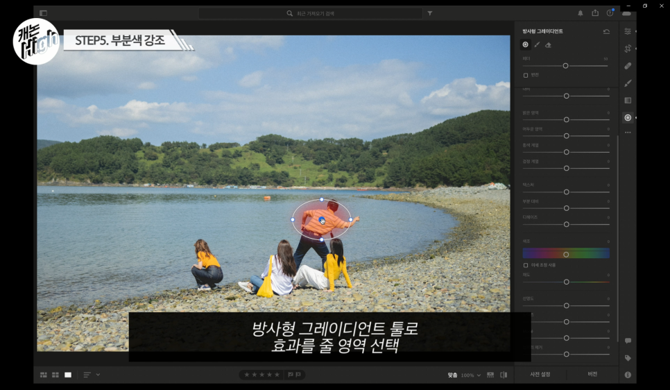 제가 노란색 값을 올리면서 몽돌 부분에 노란빛이 같이 올라갔습니다. 이 부분은 선형 그레이디언트를 사용해 색온도와 채도를 각각 -12, -39 정도 낮춰줍니다.
